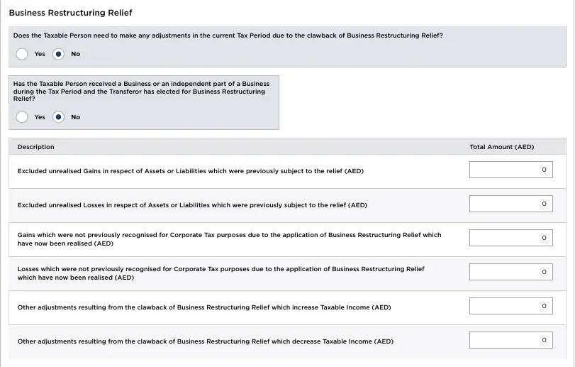 2. Has the Taxable Person received a Business or an independent part of a Business during the Tax Period and the Transferor has elected for Business Restructuring Relief?