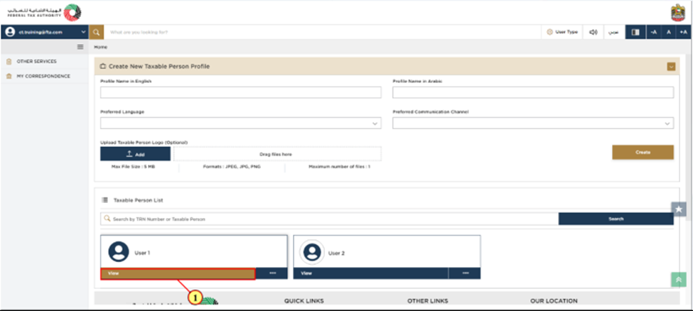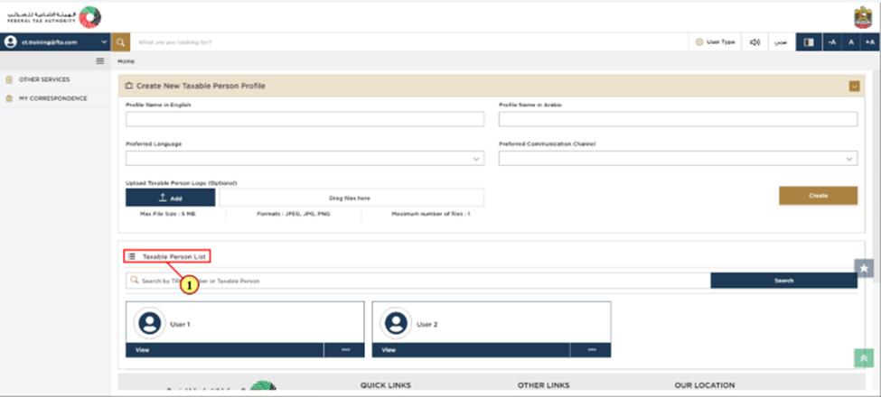 Step 2: It is important to verify whether any taxable persons are linked to your EmaraTax profile. If there is no taxable person associated with your account, you will need to add one. To create a new taxable person, please enter the required details and click Create. Once you have created one, the taxable person can be viewed on the list.