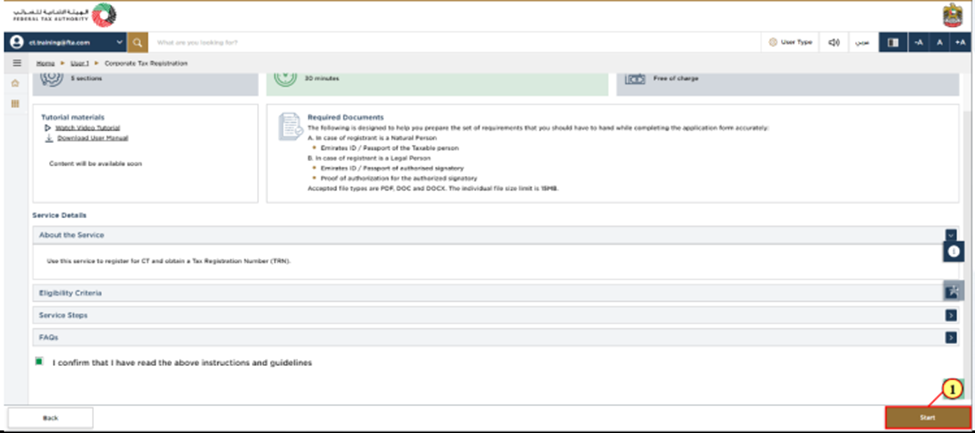 After logging into the EmaraTax portal and creating/viewing your taxable person, you must read the instructions and guidelines and mark the checkbox on the ‘Instructions and Guidelines’ page before clicking ‘Start’ to proceed with the five‑section Corporate Tax registration application.