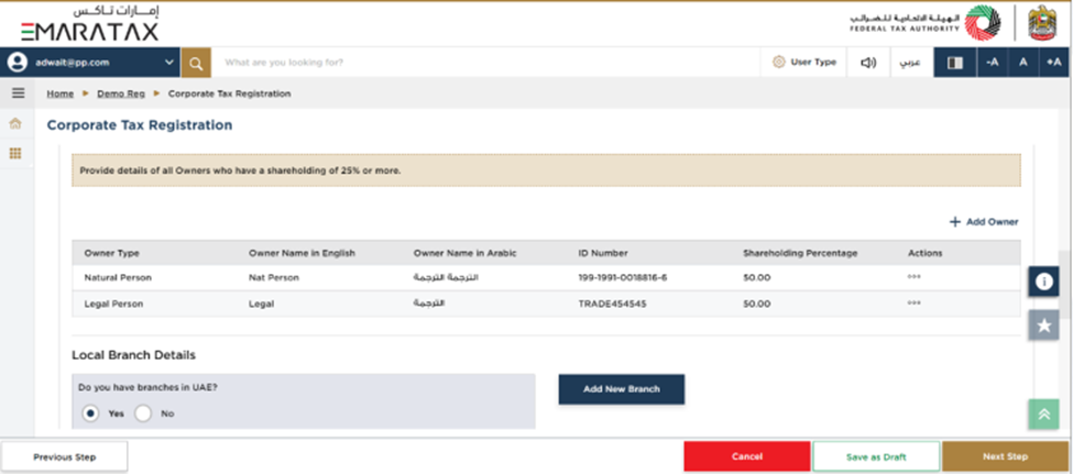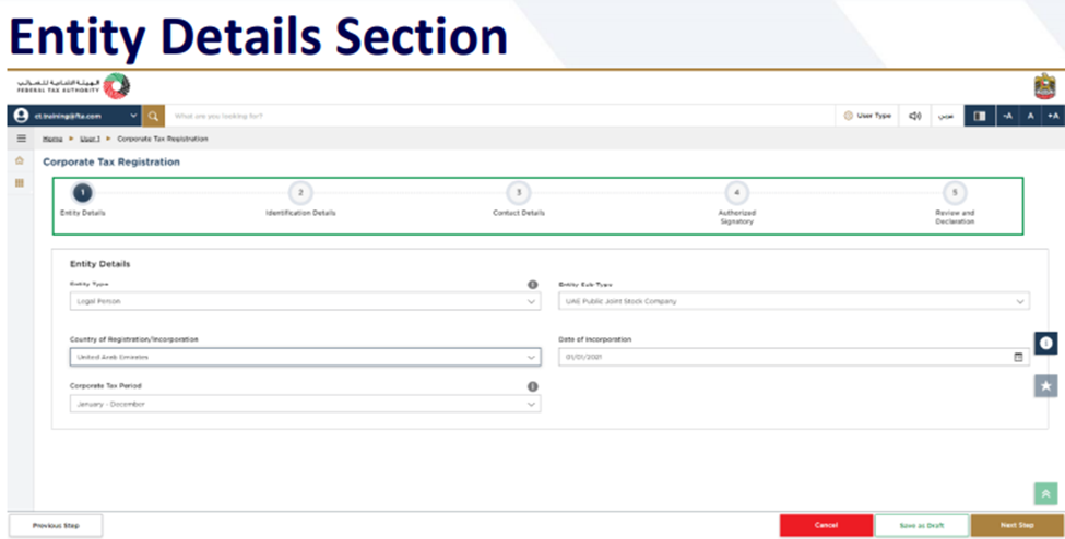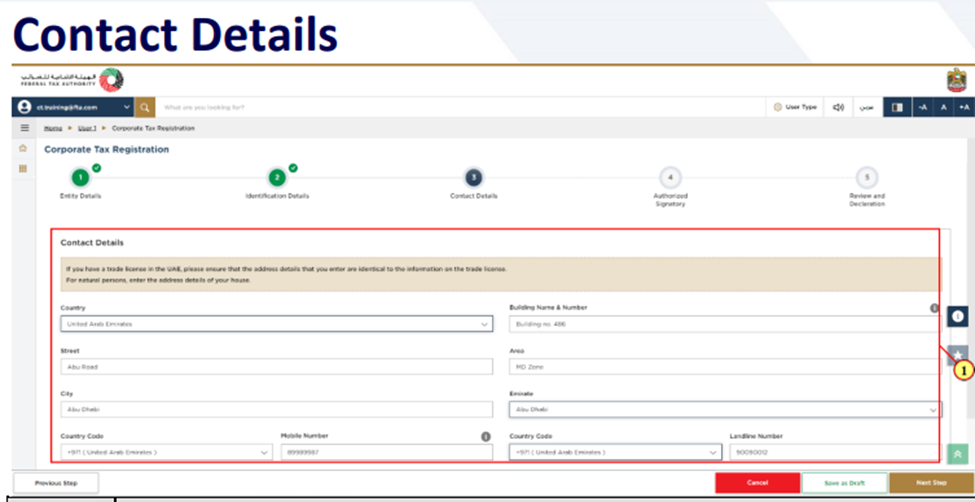 Note: By clicking "Save as Draft", you can save the information you entered and return later to complete the Corporate Tax Registration Process. Alternatively, you may click "Cancel" to cancel the registration process.
