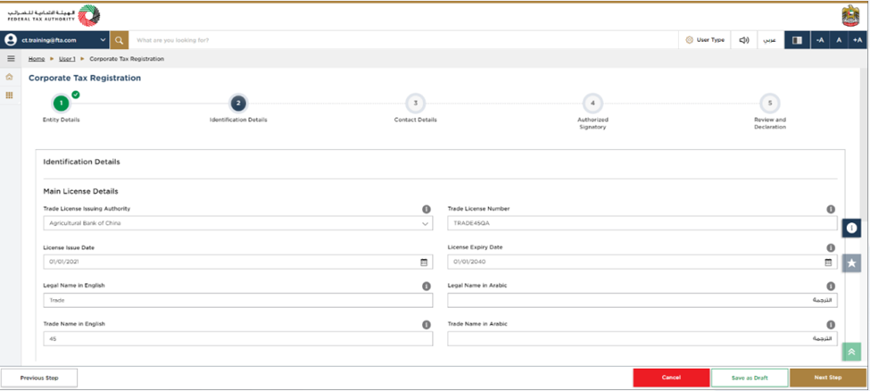 Step 7: As soon as you have completed all the required fields on the "Entity Section", click "Next Step" to proceed to the "Identification Details" section. In the Identification Section, you are required to enter the details of the "Trade License" according to the selected entity.