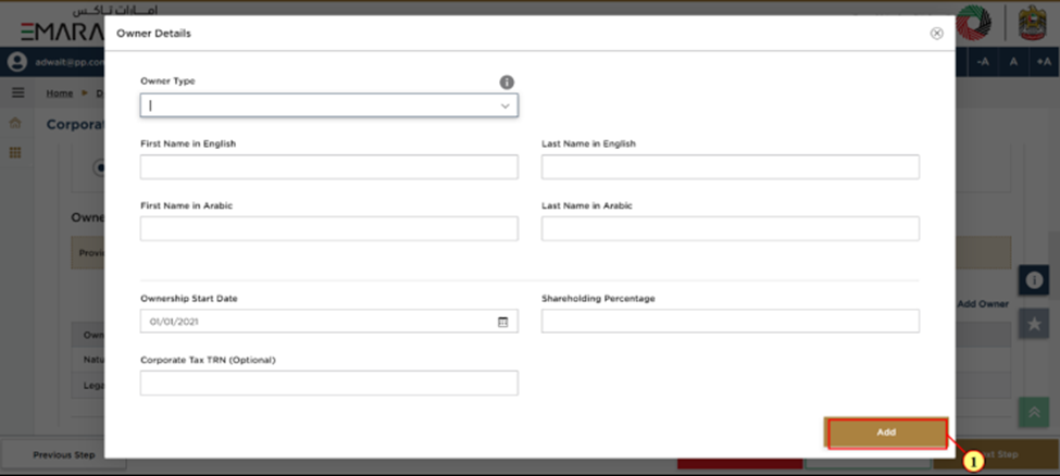 Step 10: You can enter all the owners associated with the Trade License by clicking on "Add Owners". Enter the required information about the owner and click "Add". (The owner may be a natural person or a legal person).