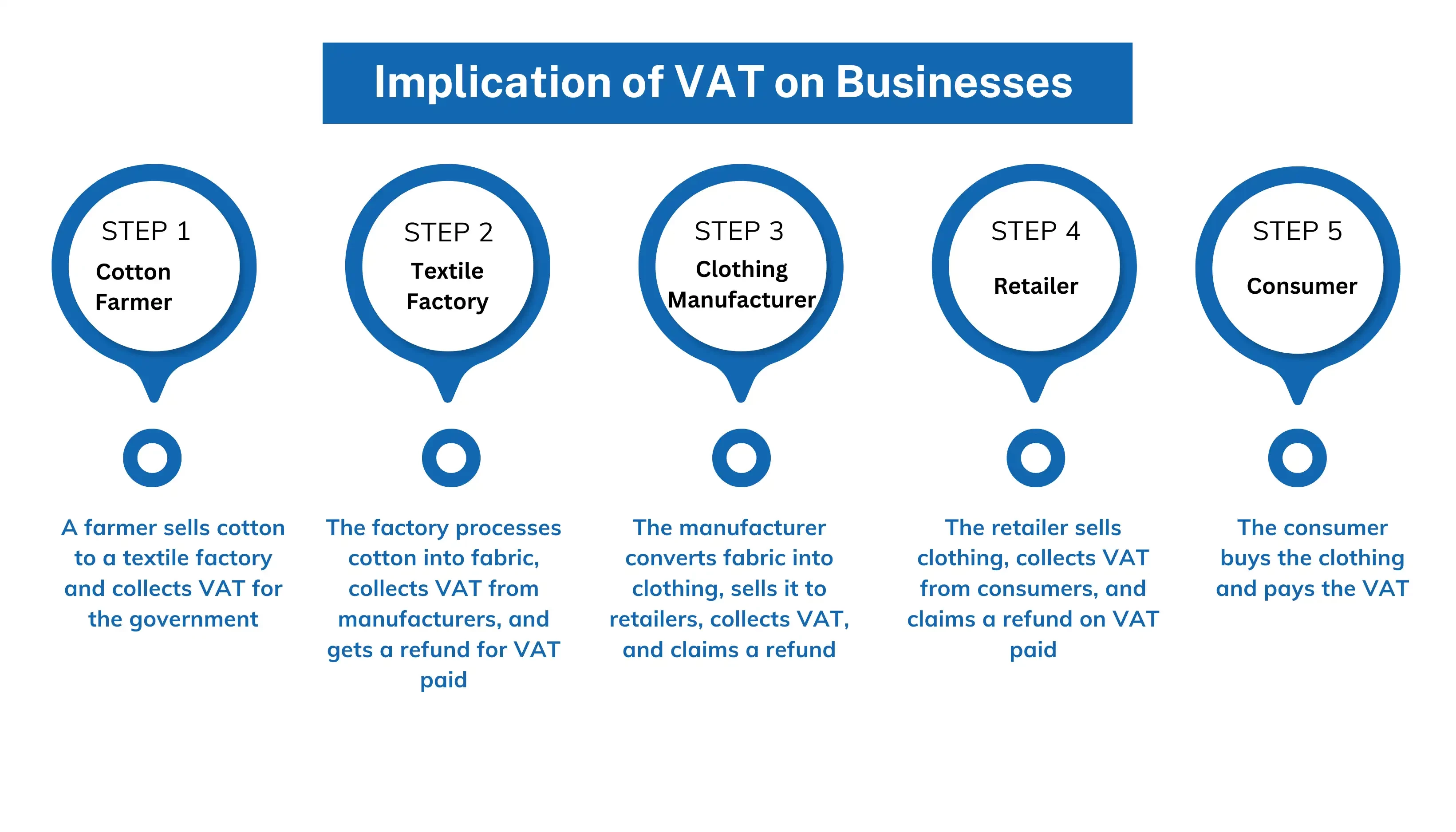 The above image illustrates the implication of VAT on businesses through a five-step supply chain process. Here's the description for each step: